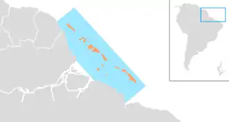 The Amazon Reef, or Amazonian Reef,[1] is an extensive coral and sponge reef system, located in the Atlantic Ocean off the coast of French Guiana and northern Brazil. It is one of the largest known reef systems in the world, with scientists estimating its length at over 1,000 kilometres (600 miles), and its area as over 9,300 km2 (3,600 sq mi). Publication of its discovery was released in April 2016, following an oceanographic study of the region in 2012. Evidence of a large structure near the delta of the Amazon River dated from as early as the 1950s.