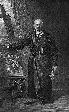 In 1818, Trumbull, representing the American Academy, commissioned a portrait of his former teacher and mentor, the painter Benjamin West, from Thomas Lawrence, widely considered to be the most accomplished English portraitist of the age.[9] Lawrence set a price of 400 guineas for the project. According to Carrie Rebora's 20th-century account, to pay for the work, Trumbull opened a subscription fund before finally taking delivery of the painting in 1822 for the academy.[10] Two earlier 19th-century accounts had said that Lawrence was made a member of the academy and painted the portrait in exchange.[11] [12]