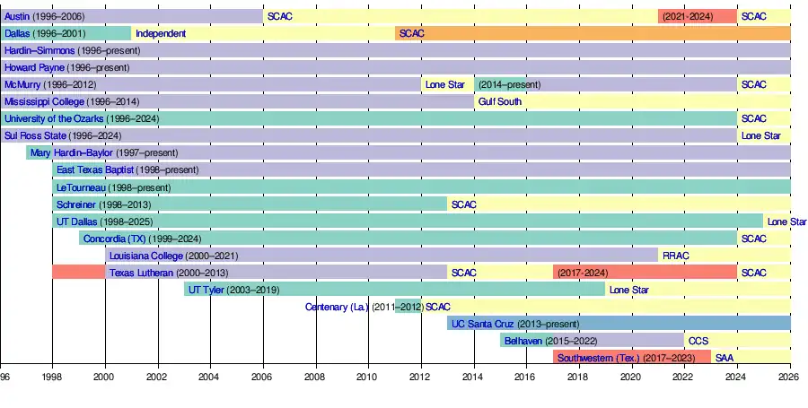 Southwestern UniversityCollegiate Conference of the SouthBelhaven UniversityUniversity of California, Santa CruzSouthern Collegiate Athletic ConferenceCentenary College of LouisianaLone Star ConferenceUniversity of Texas at TylerSouthern Collegiate Athletic ConferenceSouthern Collegiate Athletic ConferenceTexas Lutheran UniversityRed River Athletic ConferenceLouisiana Christian UniversitySouthern Collegiate Athletic ConferenceConcordia University TexasLone Star ConferenceUniversity of Texas at DallasSouthern Collegiate Athletic ConferenceSchreiner UniversityLeTourneau UniversityEast Texas Baptist UniversityUniversity of Mary Hardin–BaylorLone Star ConferenceSul Ross State UniversitySouthern Collegiate Athletic ConferenceUniversity of the OzarksGulf South ConferenceMississippi CollegeSouthern Collegiate Athletic ConferenceLone Star ConferenceMcMurry UniversityHoward Payne UniversityHardin–Simmons UniversitySouthern Collegiate Athletic ConferenceNCAA Division III independent schoolsUniversity of DallasSouthern Collegiate Athletic ConferenceSouthern Collegiate Athletic ConferenceAustin College