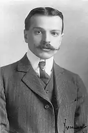 The American War Memorial (pictured at right) is a World War I naval monument located near the north end of Line Wall Road in the British Overseas Territory of Gibraltar, at the southern end of the Iberian Peninsula.[1][2][3] More formally known as the Naval Monument at Gibraltar, the memorial and steps were incorporated into the Line Wall Curtain at Prince Albert's Front giving pedestrians access to the lower Reclamation Road, Fish Market Lane, and Queensway.[3][4] The steps connected the town above with the Royal Navy facilities below.[4] The monument was designed by architect Paul Philippe Cret (1876–1945), a native of France who was a professor at the University of Pennsylvania. Cret (pictured at right) designed the memorial on behalf of the American Battle Monuments Commission. It was constructed between 1932 and 1933.[3][5][6][7] The inscription (link below) over the arch of the memorial indicates that it was "erected by the United States of America to commemorate the achievements and comradeship of the American and British Navies in this vicinity during the World War."[8][9] On the other side of the masonry arch are two bronze medallions (pictured below) depicting the seals of the United States and of its Department of the Navy. The dolomitic limestone utilised in the construction of the monument came from the Rock of Gibraltar.[4] The memorial is an example of the successful incorporation of a relatively recent work into older, existing architecture.[6]