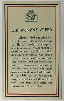 American Women's Voluntary Services (AWVS) was the largest American women's service organization in the United States during World War II.[1] AWVS provided women volunteers who provided support services to help the nation during the war such as message delivery, ambulance driving, selling war bonds, emergency kitchens, cycle corps drivers, dog-sled teamsters, aircraft spotters, navigation, aerial photography, fighting fires, truck driving, and canteen workers. Some of its work overlapped with the Office of Civilian Defense and the American Red Cross.[2]