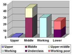 Estimates for how many households are members of this class vary with definition. According to Dennis Gilbert roughly one quarter, 25%, of US households were in the lower classes; 13% were members among the working poor while 12% were members of the underclass. While many in the lower working class are employed in service jobs, lack of participation in the labor force remains the main cause for the economic plight experienced by those in the lower classes.[1] In 2005, the majority of households (56%) in the bottom income quintile had no income earners while 65% of householders did not work. This contrasts starkly to households in the top quintile, 76% of whom had two or more income earners.[2]