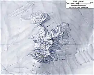 The Ames Range consists of three coalescing shield volcanoes: Mount Andrus, Mount Kosciusko and Mount Kauffman, and Mount Boennighausen.[1]