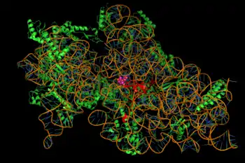 Streptomycin in complex with a bacterial ribosome. X-ray crystallographic structure of the 30S ribosomal subunit with bound drug (purple, space-filling model, at center) protein secondary structure elements such as alpha-helices in bright green, and the RNA phosphodiester backbone shown in orange (and the ladder of base pairs in dark green and blue)