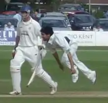 Khan was brought to the attention of Kent County Cricket Club by Ole Mortensen, a friend and former teammate of Kent coach John Wright.[7] In his first full season at Kent County Cricket Club, in 2002, he claimed 63 wickets. He failed to retain his form over the next two seasons, taking a combined total of 31 wickets.