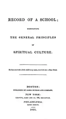 In July 1835, Peabody published her account as an assistant to the Temple School as Record of a School: Exemplifying the General Principles of Spiritual Culture.[41] While working on a second book, Alcott and Peabody had a falling out and Conversations with Children on the Gospels was prepared with help from Peabody's sister Sophia,[48] published at the end of December 1836.[39] Alcott's methods were not well received; many found his conversations on the Gospels close to blasphemous. For example, he asked students to question if Biblical miracles were literal and suggested that all people are part of God.[49] In the Boston Daily Advertiser, Nathan Hale criticized Alcott's "flippant and off hand conversation" about serious topics from the Virgin birth of Jesus to circumcision.[50] Joseph T. Buckingham called Alcott "either insane or half-witted" and "an ignorant and presuming charlatan".[51] The book did not sell well; a Boston lawyer bought 750 copies to use as waste paper.[52]