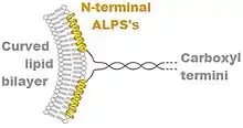 ALPS motifs are 20 to 40 amino acid long portions of proteins that have important collections of types of amino acid residues. Bulky hydrophobic amino acid residues, such as Phenylalanine, Leucine, and Tryptophan are present every 3 or 4 positions, with many polar but uncharged amino acid residues such as Glycine, Serine and Threonine between. The ALPS is unstructured in solution but folds as an alpha helix when associated with the membrane bilayer, such that the hydrophobic residues insert between loosely packed lipids and the polar residues point toward the aqueous cytoplasm.