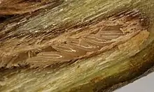 Mating is triggered by the song of the males which facilitates the gathering of many males and females. Males compete with each other to produce the loudest and best musical sound, and sing louder when the weather is warmer. Sometimes two cicadas will fight each other. Chorus cicadas usually mate on a tree trunk silently. Adult cicada have a short life span of only two to three weeks, because after mating the adult cicada die off.[7] Female chorus cicadas lay their eggs into thin branches of a wide range of plants.[13] Females lay from 5 to 700 eggs, each about the size of a grain of rice. They lay eggs in a herring-bone pattern in the thin tree branches.[10]