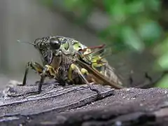 The song made by cicadas is the loudest noise made by any insect. Male chorus cicadas produce a communication song that is specific to their species, and so species can be identified by their song. A pulse group of their song is made up of five clicks where the central click (third click) is stronger than the two on either side of it. The central click can become two clicks if the cicada is tired and has no energy.[5] These clicks are made by the cicada hitting its wings against the surface it is sitting on. These pulse groups can be produced quickly and continuously in a prolonged note during chorus singing. Chorus cicadas are New Zealand's largest cicadas, with size averaging 40 mm.[6]