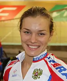 Anastasia Sergeyevna Voynova (Russian: Анастасия Сергеевна Войнова, IPA: [ɐnəstɐˈsʲiɪ̯ə ˈvoɪ̯nəvə]; born 5 February 1993) is a Russian professional track cyclist. She won the bronze medal in the 500 m time trial event at the 2014 UCI Track Cycling World Championships.[1] At the 2015 UCI Track Cycling World Championships, she won a silver medal in the team sprint and a gold in the 500 m time trial.[2] At the 2015 UEC European Track Championships, Voinova broke the 500 m time trial world record in 32.794 seconds.[3]