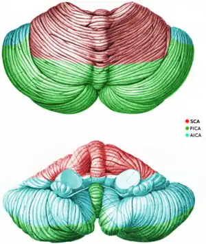 Three arteries supply blood to the cerebellum (Fig. 7): the superior cerebellar artery (SCA), anterior inferior cerebellar artery (AICA), and posterior inferior cerebellar artery (PICA).