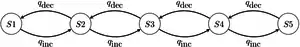 Graphical representation of an asymmetrical five-state 2-parameter Markov chain model.