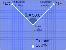 The sum of forces on all the individual anchors will commonly exceed 100%, and in some cases, the force on an individual anchor will be greater than the load. This may seem contradictory when only the magnitudes are summed. However, if the forces on the individual anchors are added as vectors, the resultant force on the anchor system is equal to the load. In simpler terms, the forces in the vertical direction are equal to the load force, but there are lateral forces as well – which increase as the V-angle increases.
