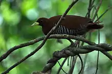 This is the largest Rallina, measuring about 34 cm in length.[4] It has a glossy chestnut plumage, extensive bold barring on underparts, unbarred undertail-coverts, relatively bright apple-green bill and relatively long and fluffy tail; legs and feet are olive-green. It also has pale barring on wings confined to outer primaries and greater and medium coverts.[4][5] Juveniles are duller and less prominently barred.[6] Other similar looking crakes include other Rallina and ruddy-breasted crake Porzana fusca. They are smaller and do not have green bill and legs.[6] Immature birds are duller overall with the barred areas being dark grey-brown with a chestnut tinge, narrowly banded and streaked dirty white. Juvenile birds are paler than adult.[4] Voice is a deep croak. It utters a sharp click as an alarm call.[4]
