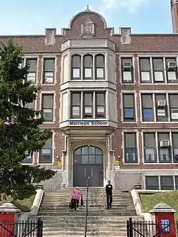 Andrew J. Morrison School is a historic school located in the Olney neighborhood of Philadelphia, Pennsylvania. It functions as a K8 school under the School District of Philadelphia.[2] The building was designed by Irwin T. Catharine and built in 1922–1924. It is a three-story, red brick building on a raised basement in a Late Gothic Revival / Tudor Revival-style. It features carved stone decorative panels and a projecting two-story stone bay.[3]