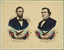 Abraham Lincoln's first Vice President was Hannibal Hamlin from Maine. Hamlin was respectable enough, but when Lincoln's prospects in the 1864 United States presidential election appeared to be dimming,[2] it was determined to replace the New Englander on the ticket. Lincoln's choice was Andrew Johnson, a slave-owning Southern Unionist who was the only member of the U.S. Senate from a secessionist state who stayed loyal.[3] (At the outbreak of the American Civil War, Tennessee had initially seceded to the Confederate States of America under governor Isham G. Harris, but when the Volunteer State was restored to the Union in 1862, Lincoln appointed Andrew Johnson to be the military governor in Nashville.)[4] Lincoln believed "that the success of his candidacy in a close contest called for the support of a large number of War Democrats who might be brought to his standard along with their vote for Johnson; and then, too, Lincoln believed that a favorable impression would be made upon observers abroad by the selection of the vice president from a reconstructed state in the heart of the Confederacy."[5]