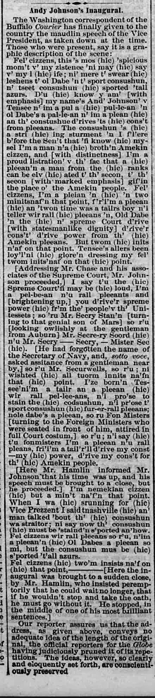 - 1 2 "Speech of Andrew Johnson". New York Daily Herald. March 6, 1865. p. 7. & "Speech of Johnson (cont'd) & Faux Pas". New York Daily Herald. March 6, 1865. p. 7.