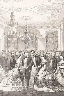 Upon arrival Johnson took rooms at the Metropolitan Hotel.[27] The day after his arrival one newspaper stated that he arrived "in fine spirits and ready to assume his important public duties,"[28] while another reported that "the health of Governor Andrew Johnson, of Tennessee, Vice President elect, is improving, but he is still unable to attend to his business."[29] He had apparently secured a "new formal black frockcoat, a silk vest, and doeskin pants" for the occasion of his inauguration.[17] As festivities for the upcoming inauguration got underway, on the evening of March 3, Johnson attended a "lavish" party thrown by John W. Forney, "with whom he shared many glasses of whisky,"[17] which reportedly left Johnson with a "thunderous hangover."[30] Another description of this party has it that "the wine flowed as freely as the oratory."[31]