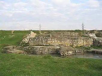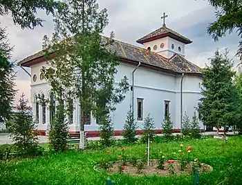 Of the institutions still associated with Andronikos, Dușca became a noted obstacle to the urban development of Buzău, extending its property over various urban plots; it had a protracted legal conflict with the laypeople, who made a habit of building townhouses on monastery land.[108] As its core building, Banului Church was rebuilt in the 1710s by Andreiana Fălcoianu, widow of Drăghici's son Șerban II.[109] Completed in 1722, it is the only surviving portion of the old monastery complex. Most of the latter was confiscated by the Romanian state in 1864; while the rebuilt church is in use, only one wall survives from the original Dușca.[110]
