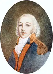 Angus McDonald was born in 1727 in the Scottish Highlands.[1][2][3] He was an immediate family member of a chief of the Clan MacDonell of Glengarry, whose clan seat was Invergarry Castle.[4][5][6] He was probably the son of Angus McDonald, who was a younger son of Alastair Dubh MacDonell, the commander of the Glengarry clan in the Battle of Killiecrankie in 1689 during the early Jacobite risings.[1][3] McDonald was a lineal descendant of a long line of military heroes of the Clan MacDonell of Glengarry and of Somerled, Lord of the Isles.[4][5] McDonald was raised and educated in Glasgow.[1][2][3] During the Jacobite rising of 1745, McDonald fought as a lieutenant under the command of Charles Edward Stuart in the Battle of Culloden, after which he was "attainted of treason".[7][8][9] He fled Scotland, departing from Inverness for the Colony of Virginia in 1746 at the age of 18.[1][4][5]