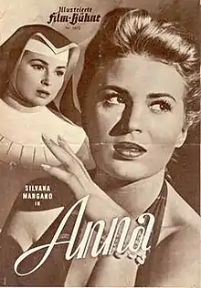 Anna is a 1951 Italian melodrama film directed by Alberto Lattuada and starring the same trio as Bitter Rice: Silvana Mangano as Anna, the sinner who becomes a nun, Raf Vallone as Andrea, the rich man who loves her, and Vittorio Gassman as Vittorio, the wicked waiter who sets Anna on a dangerous path.