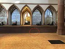 On 20 October 1975, workers discovered a brick-walled grave chamber in front of the choir, containing two well-preserved coffins sitting on a pile of bones. The upper coffin contained the skeleton of a female while the smaller coffin beneath contained the completely mummified corpse of a woman, who would later be known as the "Lady/Mummy of the Barfüsser Church."[2]