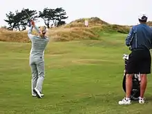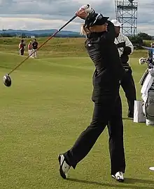 At this point in her career, Sörenstam says she lost focus having reached her biggest goals.[4] Karrie Webb became the best LPGA Tour player but Sörenstam still managed to win more LPGA tournaments than any other LPGA Tour player during the 1990s.[30] She qualified for the World Golf Hall of Fame when she won the 2000 Welch's/Circle K Championship, but was not eligible for induction until finishing her tenth year on the LPGA tour in October 2003.[38][39] Sörenstam was the first international player to be inducted into the Hall of Fame through the LPGA criteria.[40][41][42]