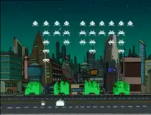 The "Raiders of the Lost Arcade" segment is a "non-stop barrage of game references" with jokes and allusions referencing a wide array of classic video games.[1] The title is a reference to the 1981 film Raiders of the Lost Ark. The segment starts off with a sequence from Asteroids. "Ambassador Kong" is a reference to the arcade game Donkey Kong, as is Italy's ambassador to the U.N. being Mario. The maze which the characters run through is a homage to the Pac-Man series. The crew exits the maze through a warp pipe from Super Mario Bros. The Nintendians' fleet is composed of ships based on the aliens from the Space Invaders series, which move in the same pattern as those in the video game ("Drop down, increase speed, and reverse direction!").[1] Fry plays to the accompaniment of a cassette tape of "Tom Sawyer" by Rush. The planet Nintendu 64 is a reference to the game console Nintendo 64. When the Milatari HQ is first shown, the green tank from Battlezone is driving past.[1] When the characters walk through the HQ, they go past doors labelled Moon Patrol and Missile Command. As the Nintendians (Lrrr, Donkey Kong, a Berzerk robot, a Robotron brain, BurgerTime's Mr. Egg, and Q*bert) exit the landed ship, one of them says the phrase "All your base are belong to us", a phrase originating from Zero Wing.