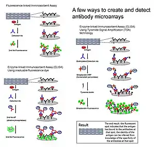 {{cite journal}}: CS1 maint: multiple names: authors list (link) - ↑ Joos T. O., Schrenk M., Hopfl P., Kroger K., Chowdhury U., Stoll D., Schorner D., Durr M., Herick K., Rupp S., Sohn K., Hammerle H. (2000). "A microarray enzyme-linked immunosorbent assay for autoimmune diagnostics". Electrophoresis. 21 (13): 2641–2650. doi:10.1002/1522-2683(20000701)21:13<2641::aid-elps2641>3.0.co;2-5. PMID 10949141. S2CID 24008668.