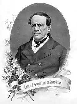 Antonio de Padua María Severino López de Santa Anna y Pérez de Lebrón (Spanish pronunciation: [anˈtonjo ˈlopes ðe sanˈtana]; 21 February 1794 – 21 June 1876),[1] usually known as Santa Anna[2] or López de Santa Anna, was a Mexican soldier, politician, and caudillo[3] who served as the 8th president of Mexico multiple times between 1833 and 1855. He also served as Vice President of Mexico from 1837 to 1839. He was a controversial and pivotal figure in Mexican politics during the 19th century, to the point that he has been called an "uncrowned monarch",[4] and historians often refer to the three decades after Mexican independence as the "Age of Santa Anna".[5]