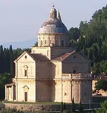 Sangallo often worked in partnership with his brother; however, he executed a number of independent works. As a military engineer he was especially skillful, building important works at Arezzo, Montefiascone, Florence and Rome. His most outstanding work as an architect is the church of San Biagio at Montepulciano, in plan a Greek cross with central dome, "the first of the great cinquecento domes to be completed".[3] and two towers—resembling, on a smaller scale, Bramante's design for St. Peter's Basilica.[4]