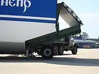 The An-124 is powered by four Lotarev D-18 turbofan engines, each capable of generating up to 238–250 kN of thrust. To reduce the landing distance required, thrust reversers are present.[10] Pilots have stated that the airlifter is relatively light on the controls and is easy to handle for an aircraft of its size.[34] A pair of TA18-200-124 auxiliary power units (APUs) are accommodated within the main landing gear fairings.[10] As a consequence of the heat and blast effects produced by these APUs, some airports require pavement protection to be deployed.[35] The landing gear of the An-124 is outfitted with an oleo strut suspension system for its 24 wheels. This suspension has been calibrated to allow for landing on rough terrain and is able to kneel, which allows for easier loading and unloading via the front cargo door.[30][10] Other features intended to ease loading including an onboard overhead crane in the cargo deck, capable of lifting up to 30 tonnes, while items up to 120 tonnes can be winched on board.[36][10] Two separate radar units are typically present, one is intended for ground mapping and navigation purposes, while the other is for weather.[10]