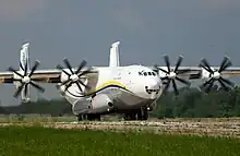 The Antonov An-22 "Antei" (Russian: Ан-22 Антей,[1] An-22 Antej; English Antaeus) (NATO reporting name "Cock") is a heavy military transport aircraft designed by the Antonov Design Bureau in the Soviet Union. Powered by four turboprop engines each driving a pair of contra-rotating propellers, the design was the first wide-body transport aircraft and remains the world's largest turboprop-powered aircraft to date. The An-22 first appeared publicly outside the Soviet Union at the 1965 Paris Air Show. Thereafter, the model saw extensive use in major military and humanitarian airlifts for the Soviet Union, and is still in service with the Russian Aerospace Forces.