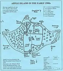 Apple Island is a 37-acre (150,000 m2) island, spanning three-eighths of a mile in length and a quarter of a mile in width.[2] The island's highest point is 960 feet (290 m) in elevation, approximately 31 feet (9.4 m) above the normal elevation of Orchard Lake.[3] The island's formation traces back to the recession of the region's last ice age glacier 10,000 to 12,000 years ago.