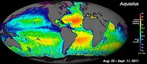 - ↑ "Aquarius Yields NASA's First Global Map of Ocean Salinity". NASA. September 22, 2011. Retrieved October 5, 2011.