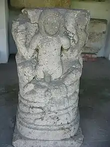 - Limestone relief (H 0.98. Br 0.55m) depicting Mithras' rockbirth. Mithras, naked and emerging from the rock to mid-thigh, holds a burning torch in his upraised left hand and a dagger in his right. The rock is encircled by a serpent who raises its head towards the god.[2]