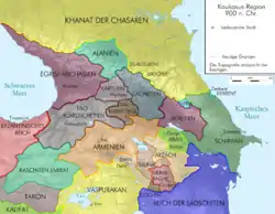 Some regions, removed from the main cities and trade routes, maintained a large degree of autonomy from the Arab rulers, notably in the west of Georgia.[9] There, in Klarjeti and Samtskhe, a noble family came to prominence during the second half of the 8th century: the Bagrationi, or Georgian Bagratids. Their origin is disputed, but it is now generally admitted that they were a branch of the Armenian Bagratuni dynasty, whose ancestor Vasak migrated to Klarjeti and was given lands there after 772, before receiving most of the former Guaramid lands after the extinction of the latter line around 786.[8] The Bagrationi established their power in Tao-Klarjeti, but soon became rivals of the emirate for the control over Georgian lands. To assert their authority, they could rely both on Byzantine intervention and on the dissensions among the Arabs. In 809, the emir of Tbilisi, Isma'il ibn Shuab, proclaimed independence from the caliphate, which sought the help of Georgian princes against the rebellion, and enrolled the Bagrationi against Ibn Shuab. In 813, the head of the dynasty, Ashot I restored the Principate of Iberia, or Kartli, for himself. He received recognition from both the caliph and the Byzantines, who bestowed upon him the official title of curopalates. This new balance between emirate and independent Bagrationi lands would continue during the next decades, the caliph supporting whichever side was less menacing to its overall authority at the moment. This allowed other Georgian regions more autonomy, and Kakheti gained its independence from both Iberia and the emirate at the time, under its own mtavari.[10] At the same time, Byzantium lost its last dependencies on the Georgian Black Sea coast, as the Kingdom of Abkhazia expanded.