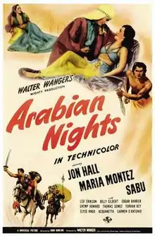 Arabian Nights is a 1942 adventure film directed by John Rawlins and starring Jon Hall, Maria Montez, Sabu and Leif Erikson. The film is derived from The Book of One Thousand and One Nights but owes more to the imagination of Universal Pictures than the original Arabian stories. Unlike other films in the genre (The Thief of Bagdad), it features no monsters or supernatural elements.[3]
