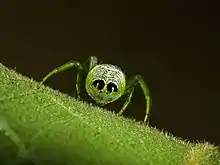 Araneus praesignis[1] is a species of orb-weaving spider found in Queensland, Australia, where it is widespread and common in well-vegetated areas. The Atlas of Living Australia[2] shows a record from New South Wales. It has bold black blobs on its rear, perhaps mimicking eyes. In 2014, Carly Brooke Martinetti gave it the common name "Alien Butt Spider,"[3] by which it became internationally known.[4][5][6][7] Due to its memorable common name and strange appearance, photographs of the spider have appeared in many online blogs and galleries.[8][9][10][11][12] The purported 2015 sighting from China[13] is of a different species of orb weaver because it has a different pattern of dark patches on the back, and the photo does not show the actual alien eyes from which the common name is derived.