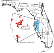 The Arcadia Formation and Tampa Member is located southwestern flank of the Ocala Platform from Pasco County and southward in to Hillsborough, Manatee, and Sarasota County, Florida. The Tampa Member and the lower part of the Arcadia Formation form the upper part of the Floridan Aquifer system in parts of southern Florida.[1]