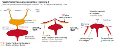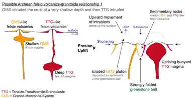Fig 5. Possible relationship 1 of Archean felsic volcanic rocks and granitoids. GMS may have intruded the crust at a very shallow depth, and later TTG intruded.[9]