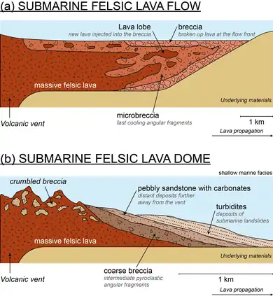 Effusive felsic lava flows elongate several kilometres. During an eruption, lava continuously wells out from the vent, then starts to flow outward on the sea floor. Due to quenching, lava is rapidly fragmented to form breccia.[40] A new lobe of lava is injected inside the breccia but it is cooled less quickly, and pushes the flow further outwards.[7]