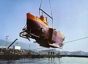 Archimède was christened on 27 July 1961, at the French Navy base of Toulon. It was designed to go beyond 30,000 feet (9,100 m),[5] and displaced 61 tons.[6] In October 1961, Archimède passed its first dive tests, diving to 5,000 feet (1,500 m) unmanned.[7] On 27 November 1961, Archimède achieved a speed of 3 knots (5.6 km/h; 3.5 mph), over a distance of 4.5 miles (7.2 km) at a depth of 7,870 feet (2,400 m) in the Mediterranean Sea.[8]