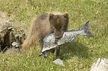 An Arctic fox (summer morph) with salmon