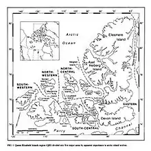Queen Elizabeth Islands region (QEI) divided into five major areas by apparent importance to arctic-island wolves.[9][10]
