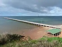 Although the surrounding grain farmers continued to prosper, there was little change in the size of the town during the early 1900s. After the depression in the 1930s, the town and its businesses were largely stagnant until a large open-cut dolomite mine was opened by BHP in the 1950s for use at its Whyalla Steelworks on the Eyre Peninsula and Port Kembla in New South Wales. A new 1-kilometre (3,300 ft) long jetty was added and at the same time construction was started with grain storage silos. The "new" jetty currently services ships loading dolomite, grain and salt from the solar salt pans at Price, located approximately 10 kilometres (6.2 mi).[8] The wharf is located 1.5 kilometres (0.93 mi) south of the town jetty, and can accommodate vessels of Handymax class.