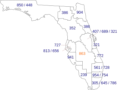 Florida area codes: 239, 305/786, 321, 352, 386, 407/689, 561, 727, 772, 813, 850/448, 863, 904, 941, 954/754