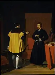 The original version is an oil on panel and measures 44 cm x 33 cm (17 in. x 13 in.). It depicts Aretino standing as he confronts the emissary who stands at the left. Fearing the satirist's mockery after the debacle of Charles' Algiers expedition of 1541, the emperor has sent the ambassador to present Aretino with a gift of a gold chain, intended as a bribe. Holding the chain, Aretino declares: "Here is a trifling gift for so great a folly".[1] A young man is in the background at the right. The painting is in a private collection, though a preparatory compositional sketch entered the Musée Ingres at Montauban in 1867.[2]