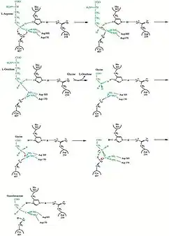 The actual reaction catalyzed by AGAT is the synthesis of guanidinoacetate from arginine and glycine, with ornithine as a byproduct. The guanidinoacetate produced is then combined with S-Adenosyl-L-methionine, a reaction catalyzed by GAMT, to produce creatine and S-Adenosyl-L-homocysteine. The mechanism by which the AGAT catalyzes this committed step follows a ping-pong mechanism, and involves the transferring of an amidino group to the Cys407 residue on the protein from L-arginine, which leaves as L-ornithine. The His303 residue then extracts a proton from glycine, which then picks up the amidino group from Cys407 in exchange for a proton to become guanidinoacetate and renew the catalyst.[2]