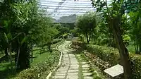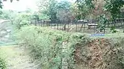 The zoo is located within the Vandalur Reserve Forest area.[24] The zoo's ecosystem consists of dry deciduous and dry evergreen scrub forest vegetation of the Eastern Ghats, a degraded forest consisting of mostly thorny bushes, receiving an average annual rainfall of 1,400 millimetres (55 in) and an average annual temperature of 26 °C (79 °F).[25] The terrain is a gentle undulating one[21] ranging in altitude from 10 to 100 metres (33 to 328 ft) with an average elevation of 50 metres (160 ft) above sea level.[25] The park was designed to keep the natural vegetation of the area intact except where enclosures, roads, and structures had to be constructed. Originally a sparse scrub forest invaded by weeds, consisting of species such as Carissa sp., Gmelina sp., Eugenia sp., Acacia sp., Instia sp. and a few other dry evergreen forest species, the park's vegetation was gradually enriched by planting dry evergreen species.[25] The entire campus has been fortified by means of a compound wall,[26] preventing any biotic interference in the park and allowing the natural growth of vegetation, which give the park the look of a natural forest. The park is built based on the 'open zoo' concept. The exhibits were originally based on taxonomic and geographical distribution of the species, but have now been replaced by ecological niches and habitats. The order of priority is local species, followed by regional, national, and international species. The use of moats has made it possible to house predator and prey in extended enclosures that provide a panorama of wildlife. There are over 75 moated enclosures in the park. Enrichments in the form of ladders, climbing materials, etc. are provided for the animals to move around the enclosure freely.[27]